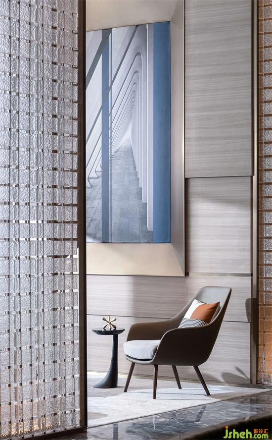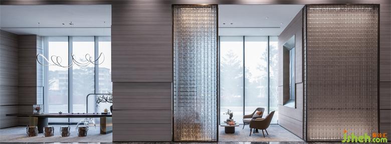 洽談區(qū)以四面圍合的形態(tài)環(huán)繞沙盤空間,深圳營(yíng)銷中心設(shè)計(jì)以玻璃磚墻打造空間的界限與連接,營(yíng)造澄澈通透的情境體驗(yàn)。結(jié)合室外的景觀、碧藍(lán)天空,植入洽談功能,在繁華的都市中感受“長(zhǎng)煙一空”、“漁歌互答”的寧?kù)o悠然。