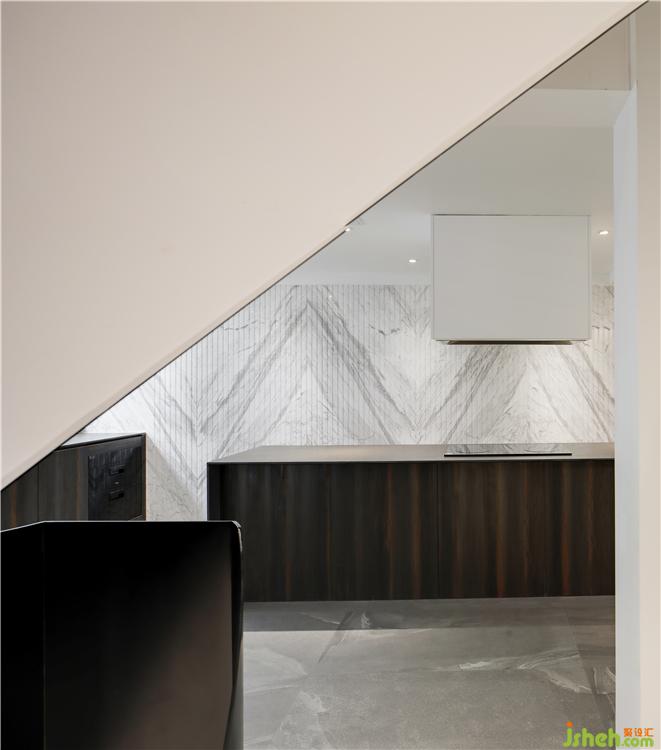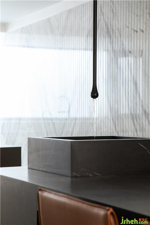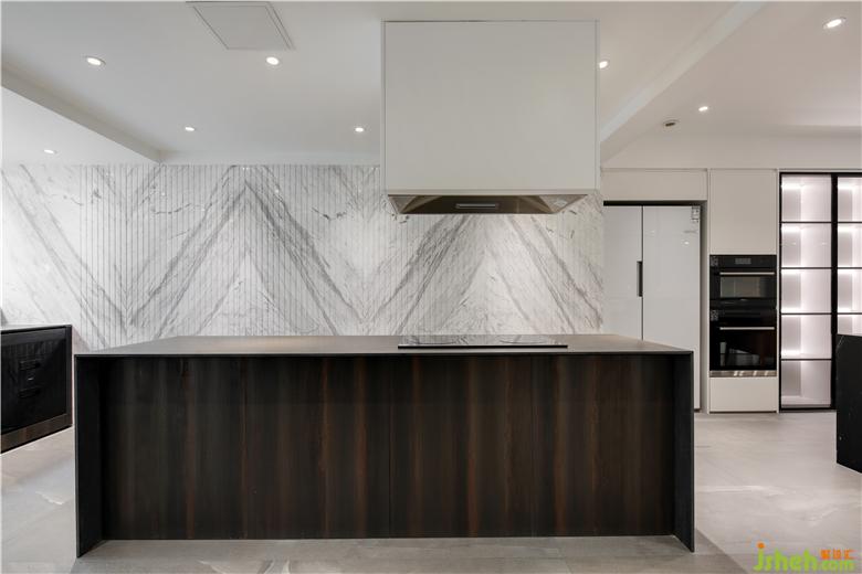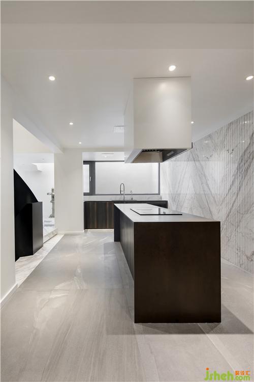 疊墅設計針對業(yè)主個性化精致化的生活方式,設計師對空間進行拆解、整合。拾級而下負一層,充滿藝術感與儀式感的精致廚房餐廳隨之而入,打造出空間場景更多的可能性。