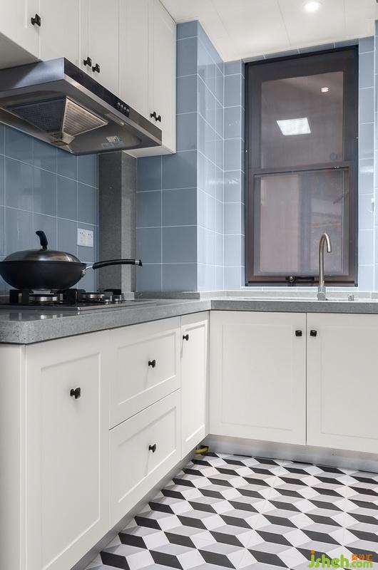 白色櫥柜搭配亮面小藍(lán)磚。小花磚很好看就是鋪貼人工費(fèi)有點(diǎn)小高,哈哈。