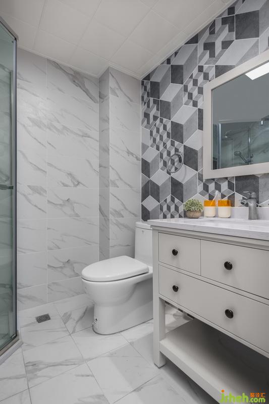 衛(wèi)生間大面積使用大理石紋路墻地磚,局部配幾何小花磚,立體感就這樣出來(lái)啦。