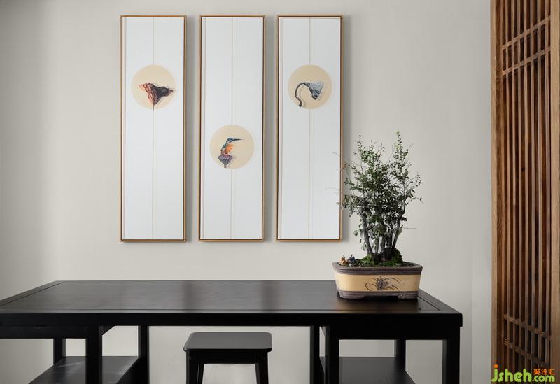 近看3副掛畫統(tǒng)一一體,美如潑墨山水間。