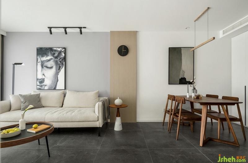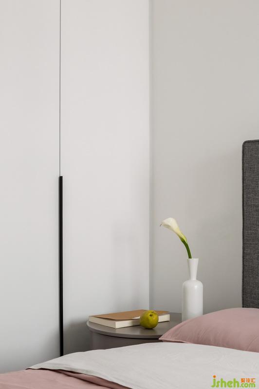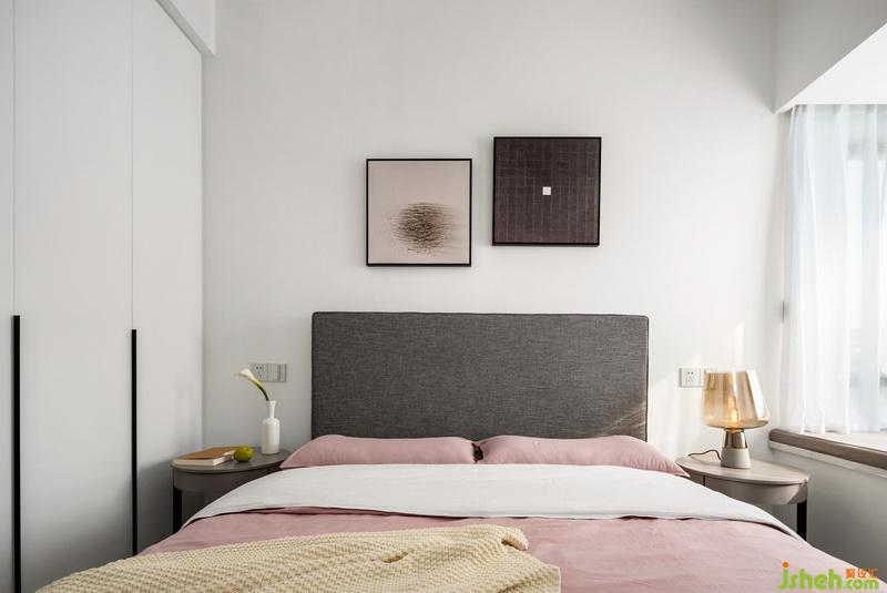 次臥硬裝整個空間以白和灰為主,怎樣讓整個空間更活潑一點呢?一副個性相錯的畫,一套粉白四件套就是點睛之處。在掛畫的時候,我們臨時根據(jù)現(xiàn)場調(diào)整掛畫方式,按照常規(guī)兩幅畫在一個水平線上,但是覺得過于刻板,調(diào)節(jié)后的畫面感覺更生動。