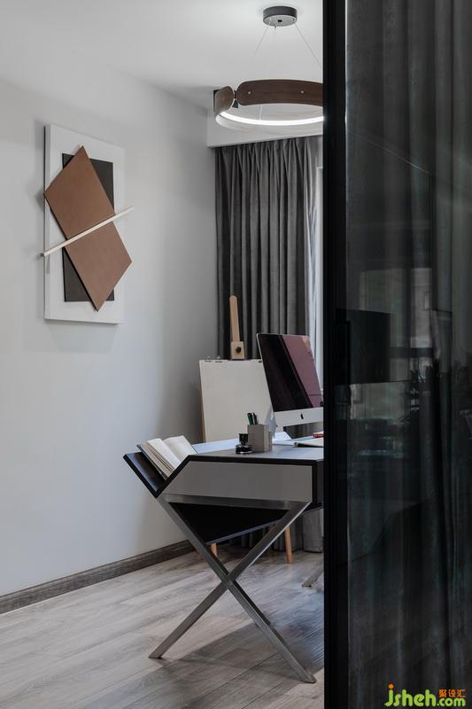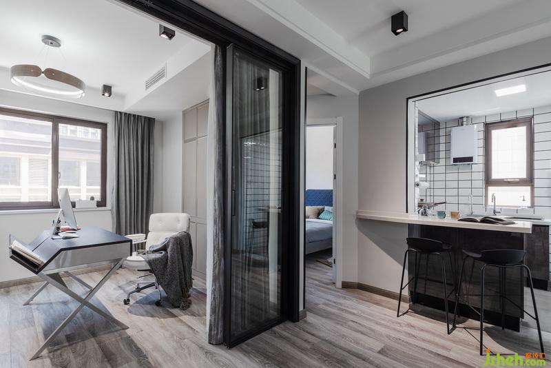 隱與顯。書房采用半開放式設(shè)計,廚房為開放式廚房,空間的隱蔽與顯現(xiàn)結(jié)合。重點強調(diào)視覺和舒適度。書房的柜子也是嵌入墻體的設(shè)計方式,規(guī)整空間。