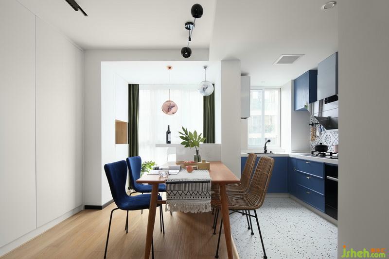 餐廳一組柔和的餐椅組合,復(fù)古藍(lán)點綴,營造出輕松舒適的開放空間,個性吊燈提高了整個空間的活躍度。現(xiàn)場制作的一整面白色餐邊裝飾柜,臨窗而設(shè)的吧臺,靜與動自然流暢。
