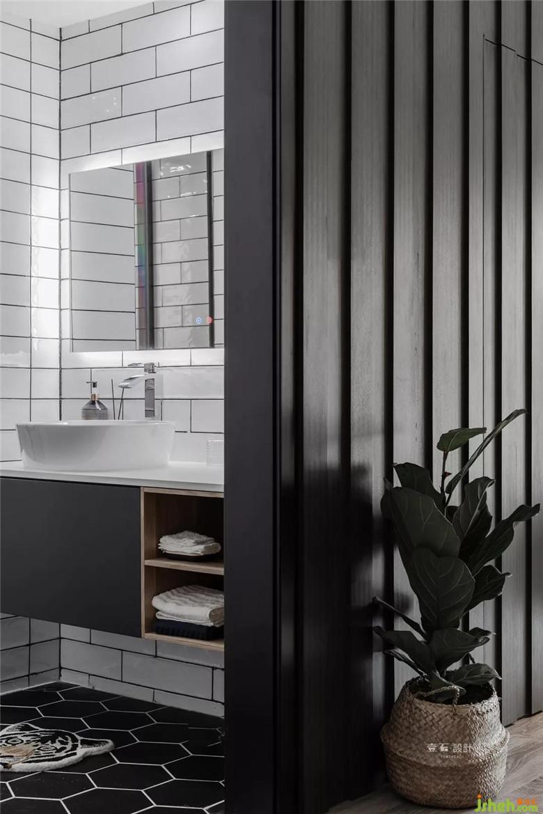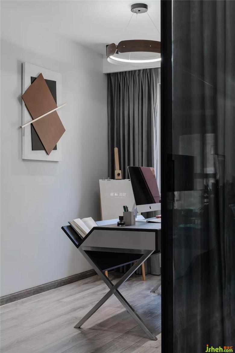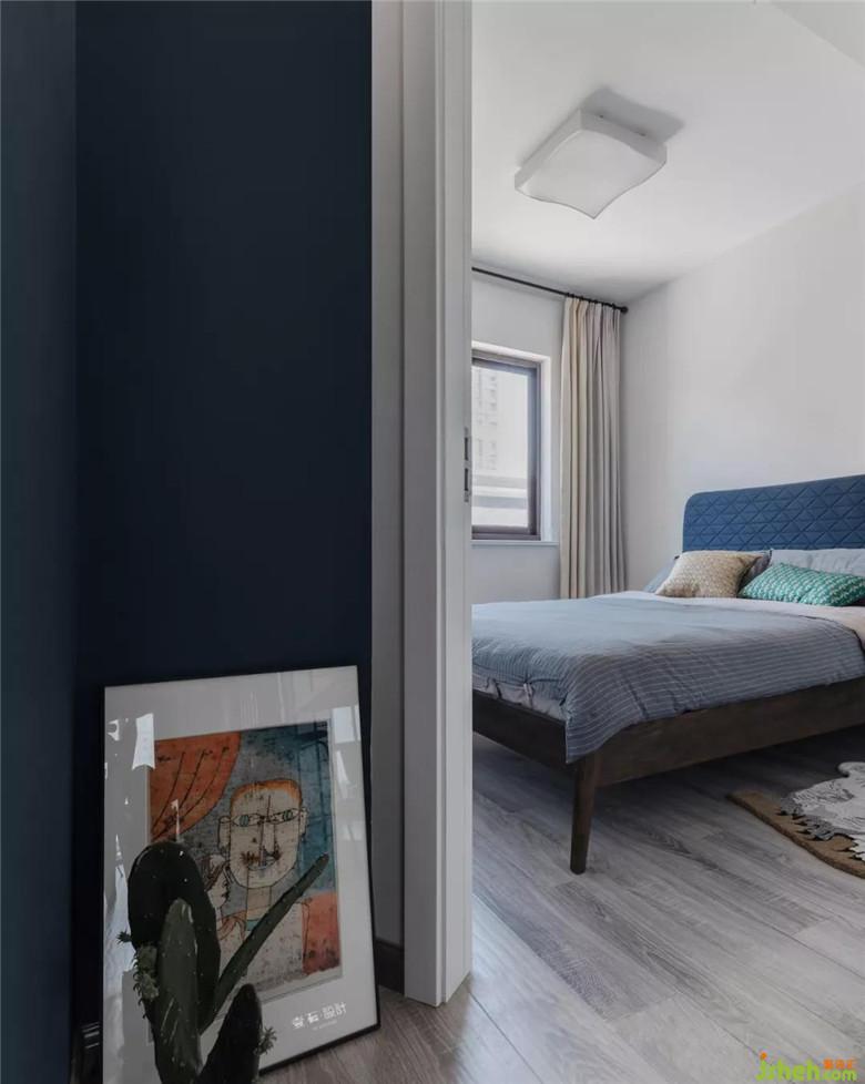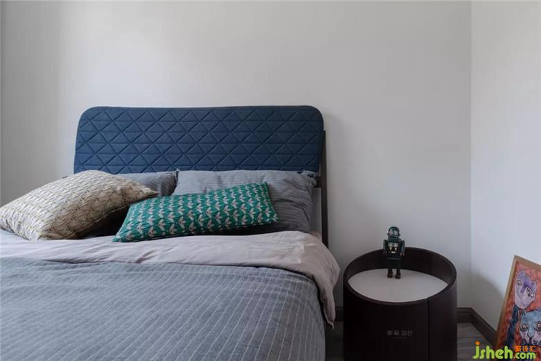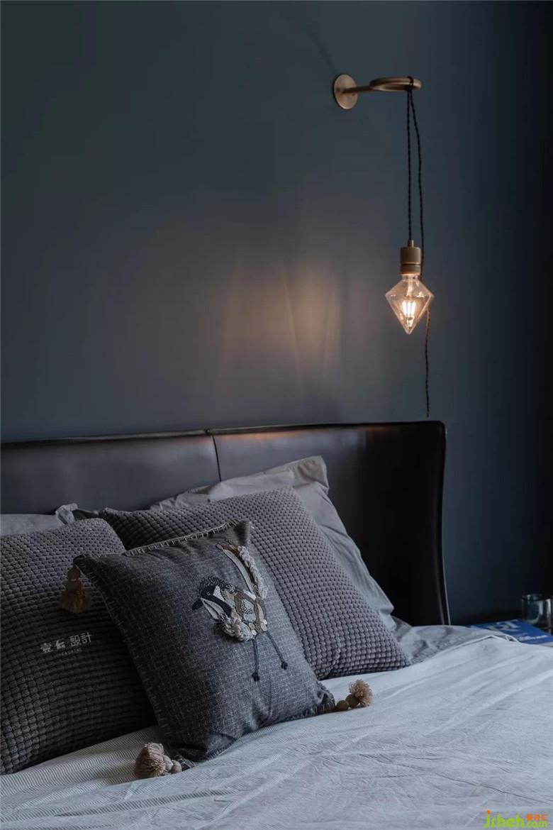 主臥床頭背景室內設計師選用深色藍配上皮質床,與人而言氣質是一種精氣神,對物而言看著就讓人心情愉悅而美好?!肚f子·盜跖》里就提出美麗的東西讓人身心舒暢,想要更好地生活,快樂地生活。所以我們需要讓自己更多的接觸美,讓自己更多的處在美的環(huán)境。
