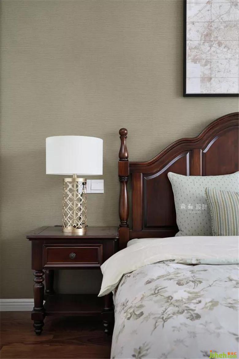 裝修公司淡淡的背景襯托床和床頭柜光澤度更為飽滿,點綴精致臺燈和掛畫,一處一景,美哉。