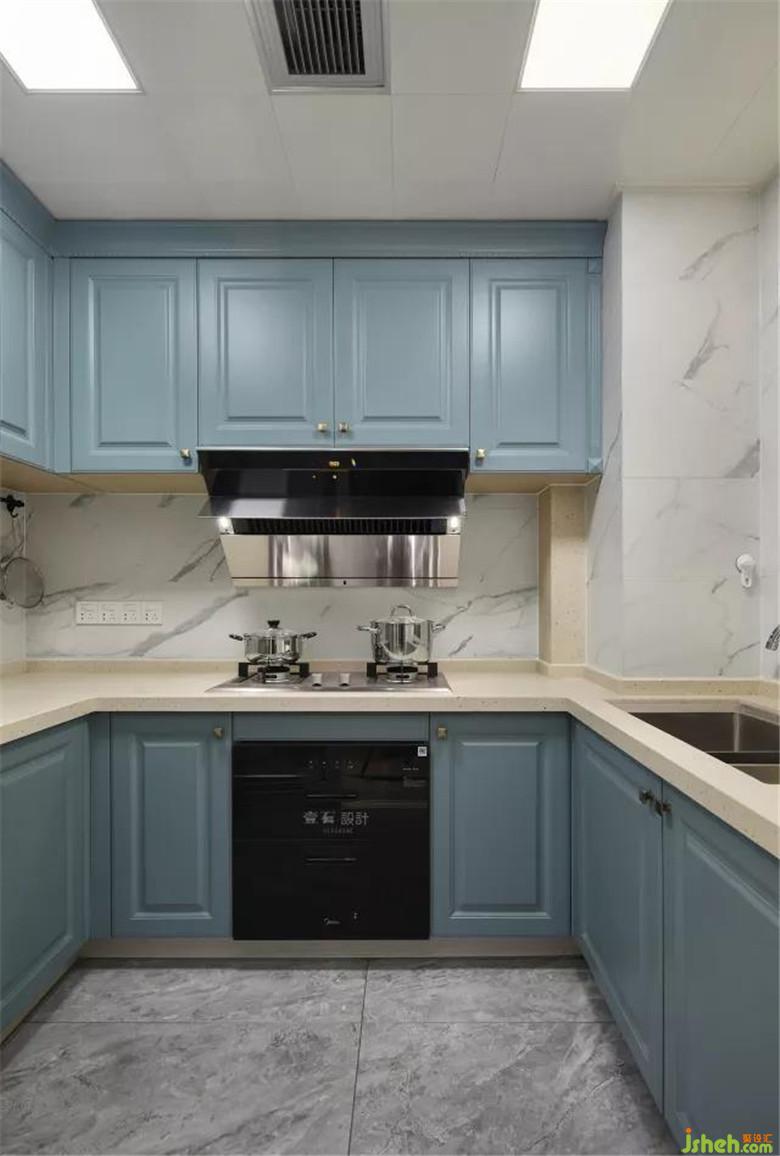 廚房裝修公司選用了純凈質感爵士白石材配上藍灰櫥柜,大氣又高雅。
