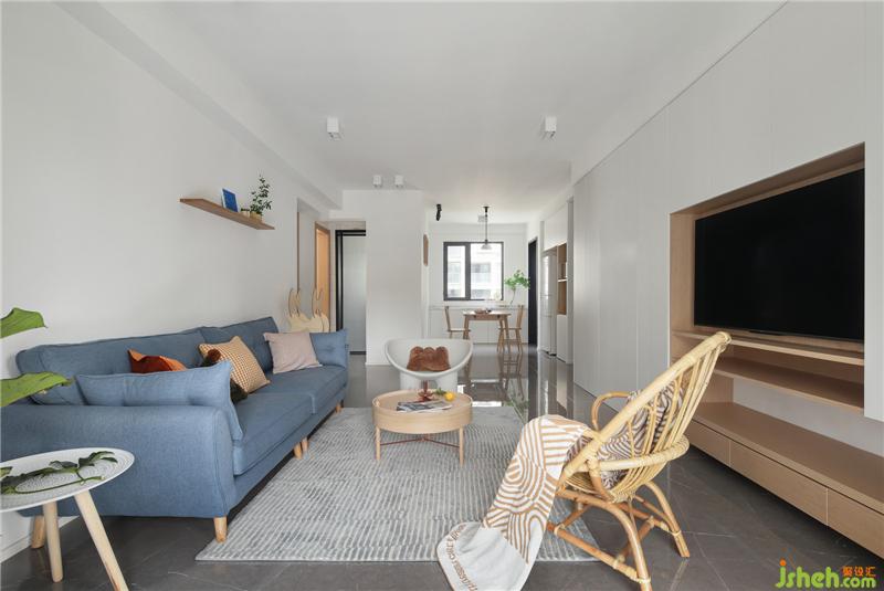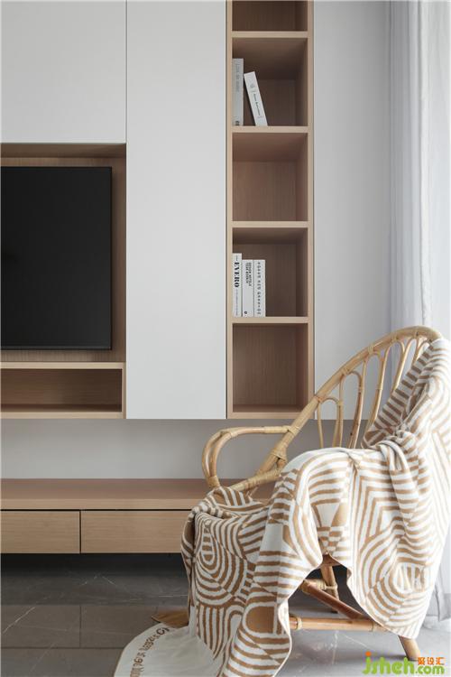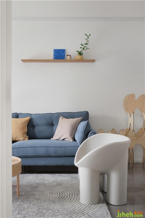 留白沙發(fā)背景,延續(xù)純凈主題,局部添加了一段隔板,可以擺放一些精致的小物,表達對生活的熱愛,也豐富了墻面的層次。