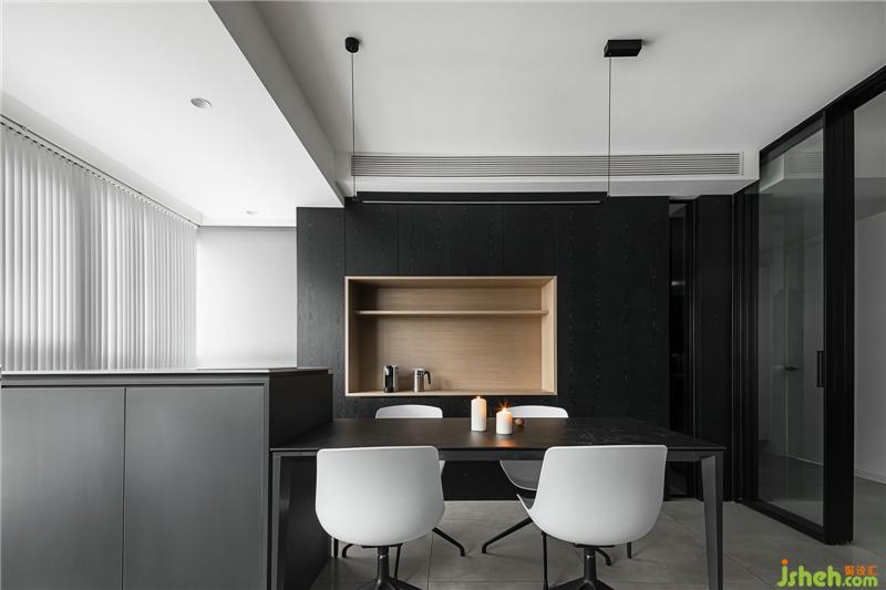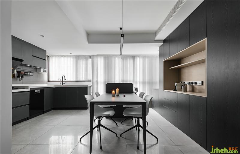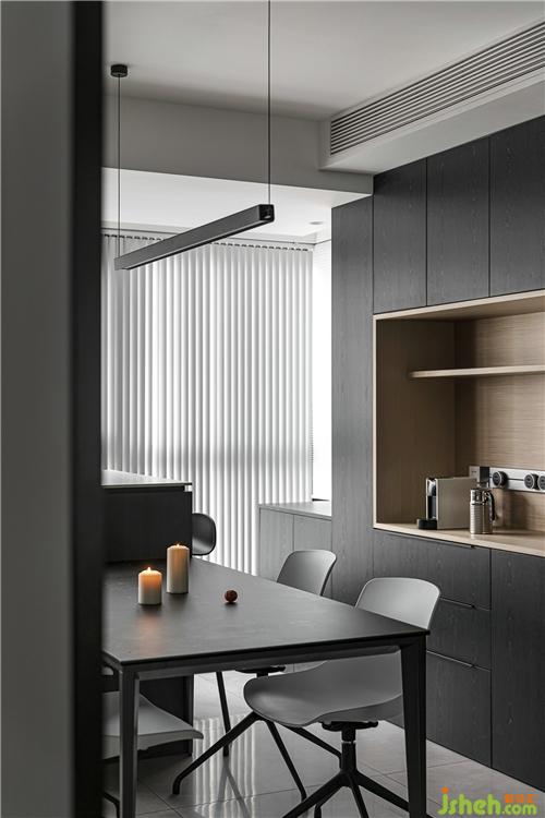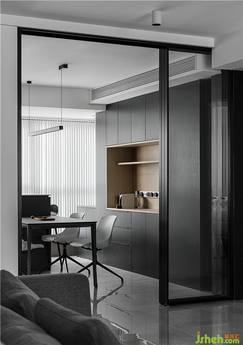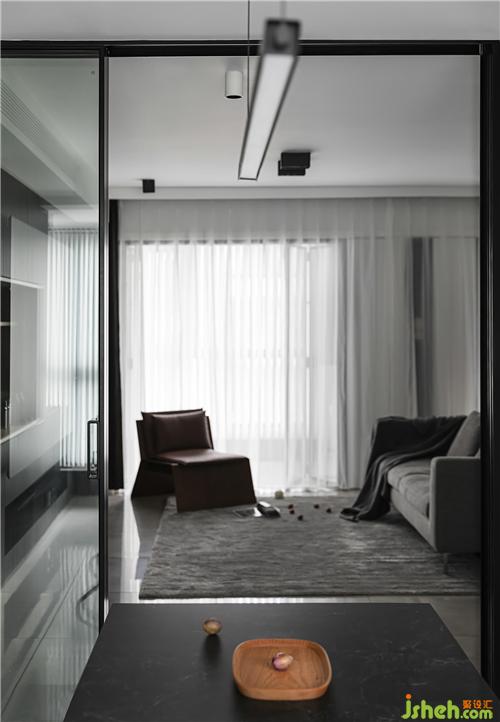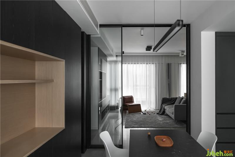 玻璃門(mén)劃分廚餐廳和客廳的空間,透露質(zhì)感,也解決了油煙的困擾。