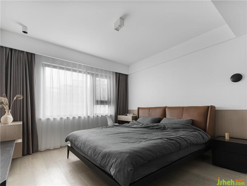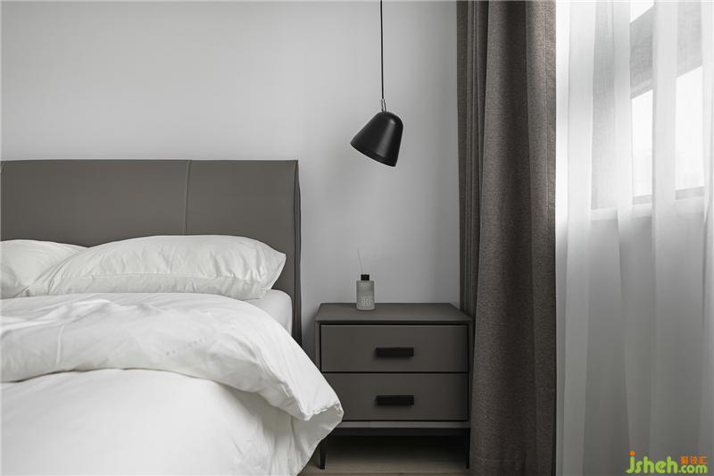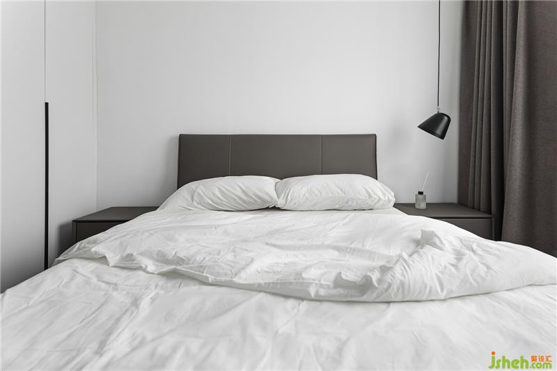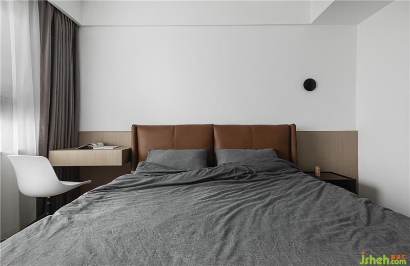 床尾采用了平板與柜體的交合處理的方式,增加臥室放置臺(tái)面,適宜的小景點(diǎn)綴,別具一格。
