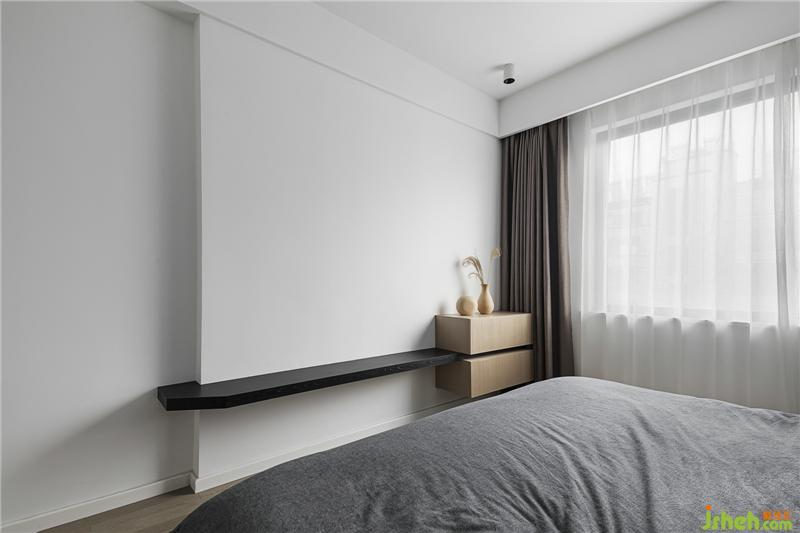 The end of the bed adopts the way of the intersection of the flat plate and the cabinet body, increases the table top in the bedroom, and the suitable small scenery embellishment has a unique style.