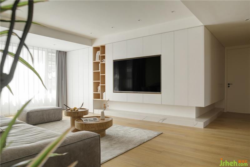 From the door cabinet to the balcony cabinet, form a ring. The top is a large number of storage cabinets, and the bottom is designed with a floor platform, which makes the whole space transparent and hierarchical.