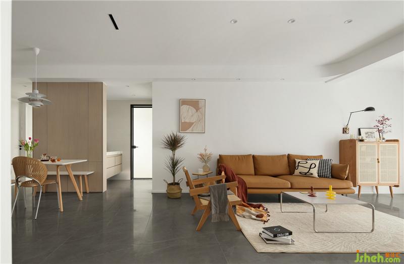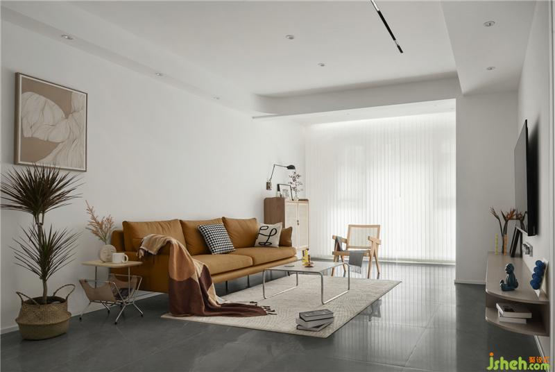The background of the sofa is clean and simple, and the wood orange gives off a warm feeling.
