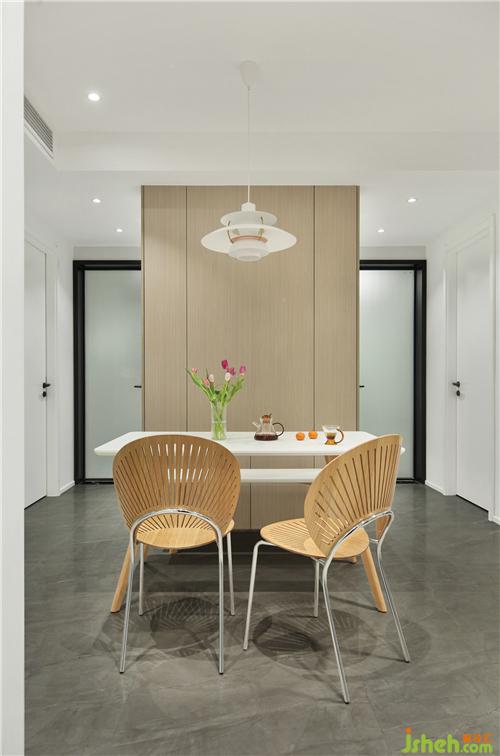餐廳背景墻用木飾面裝飾,剛好與雙干區(qū)形成整體。南京室內(nèi)設(shè)計(jì)師廚房的玻璃移門(mén),劃分空間,讓空間通透。