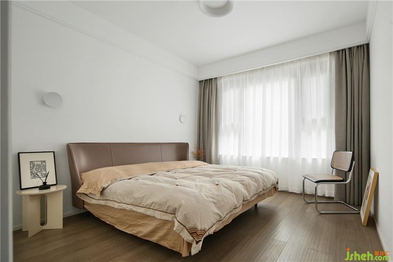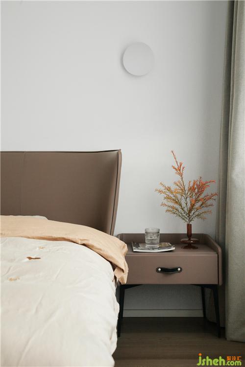 After the master bedroom's bathroom is put out, it becomes a pure rest space, a pair of simple wall lamps, leather bedside, the choice of bedroom materials and colors continue the keynote of the living room, and the overall aesthetic feeling comes from it.