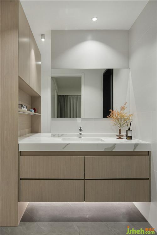 The design of hanging cabinet in dry area is continued, considering practicality and beauty in all aspects. Marble table and wood veneer form a material contrast, a rigid and a flexible room to enhance the temperament, reserve small partition, also can facilitate the placement of daily small objects.