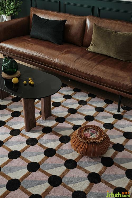 棕色皮質(zhì)沙發(fā),玻璃茶幾,帶有幾何元素的地毯,復(fù)古的味道油然而生,設(shè)計一個家,圓一個夢。