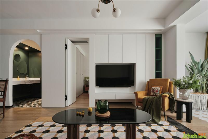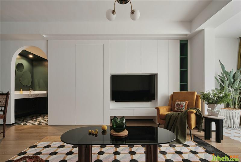 電視背景墻,是通過將客廳與主臥的墻體打掉,借用了一些主臥面積增加客廳儲物南京裝修設(shè)計,通過改變主臥進(jìn)入方式,也讓主臥的儲物空間變多。