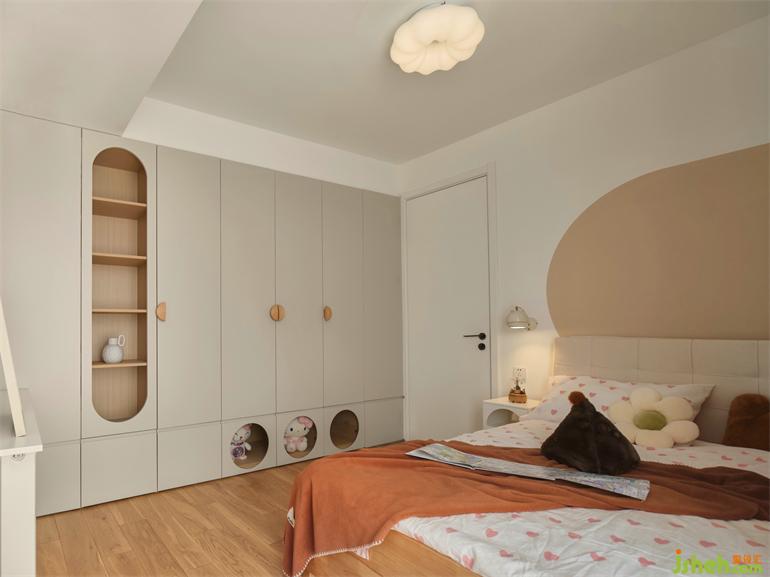 女孩房以俏皮活潑為理念,墻面用粉色點綴,柜子局部形態(tài)可掬,復(fù)式裝修設(shè)計最底下的柜子除了可愛還方便孩子拿取。