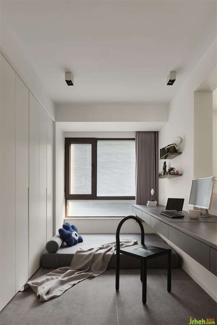 4米+懸掛式書(shū)桌,3米+頂天立地的衣柜,這個(gè)空間兼顧辦公和儲(chǔ)物。放置一張可折疊式沙發(fā)床,一床兩用,既是小沙發(fā)也可以作為床鋪。