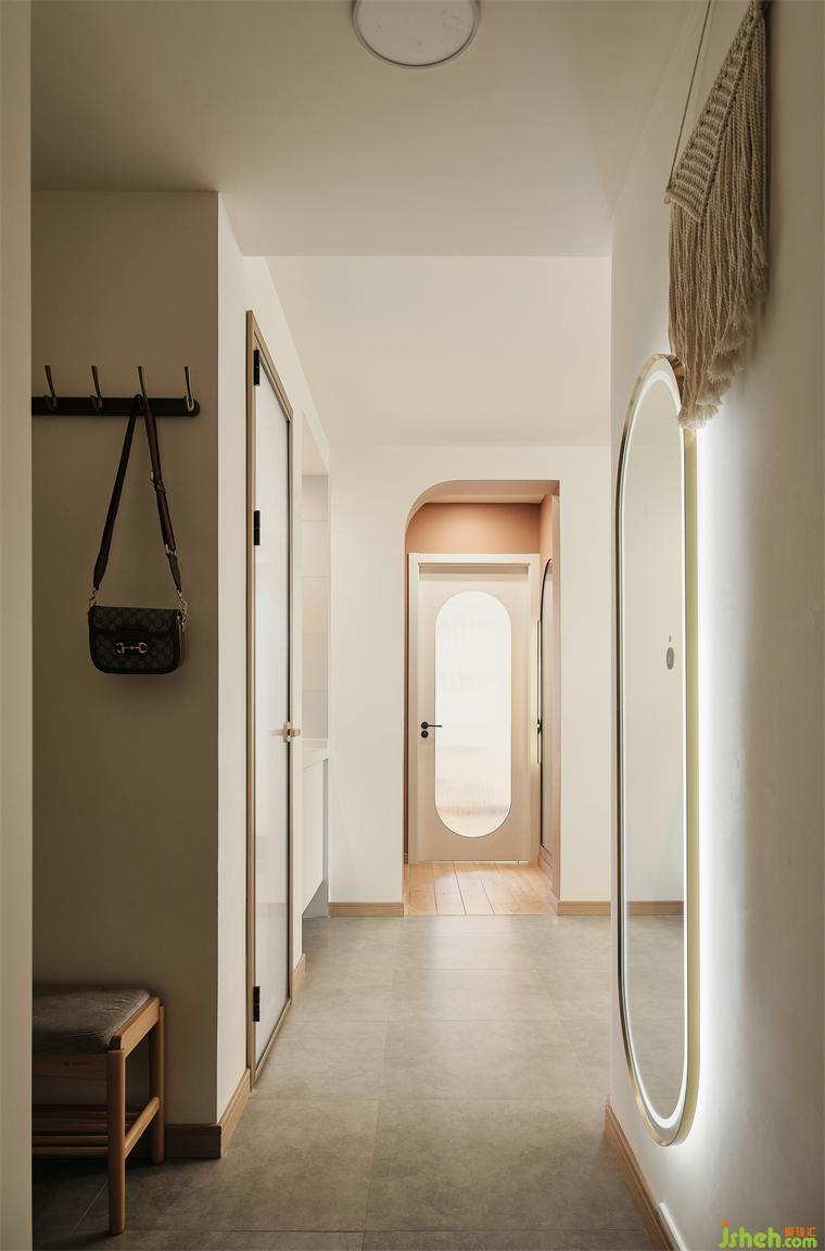 主臥看向客餐廳視角,藕粉、原木色、茉莉黃等暖色系組合,裝修公司散發(fā)出自然的溫馨感。