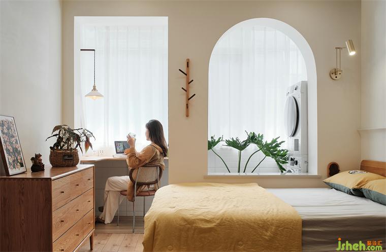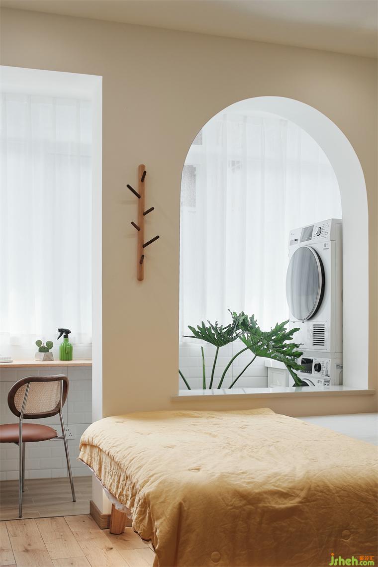 陽臺并入臥室,取消原來的窗戶,用弧形窗洞做成隔而不斷的效果,也增多臥室內(nèi)部的光線。