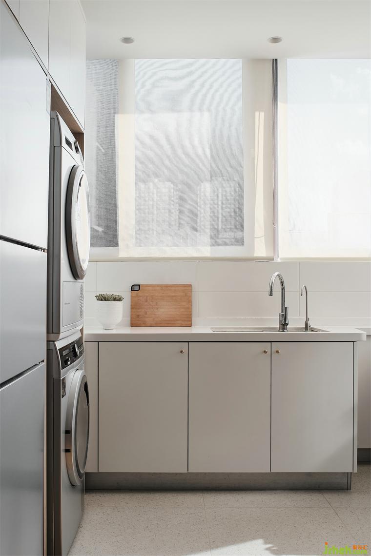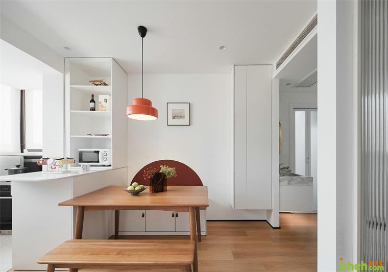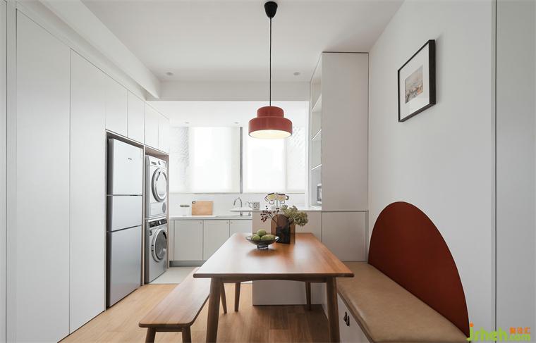 餐廳背景墻做了卡座和局部彩色墻設(shè)計(jì),補(bǔ)充餐椅的功能,節(jié)省空間而且卡座下面還可以儲(chǔ)物。