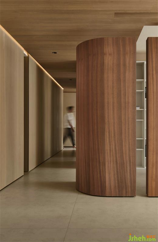 長走廊,巧“留白” 中間有一段空隙,呼吸感,留給視覺喘息的空間。裝修公司書房采用有隱蔽性,但和外界仍相連的半開放式設(shè)計(jì),弧形墻讓空間有了趣味的生動(dòng)。