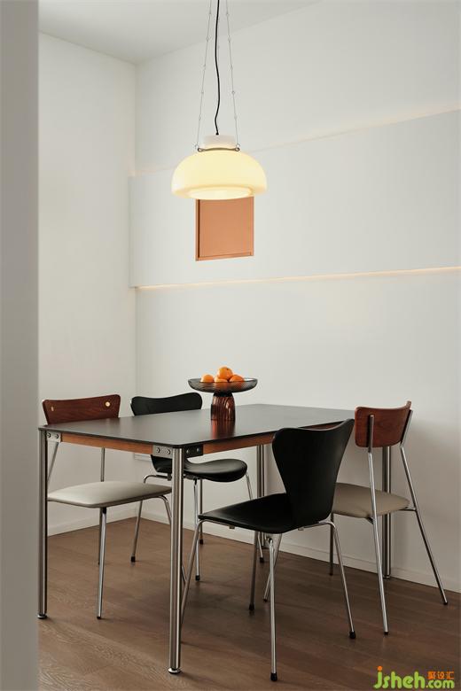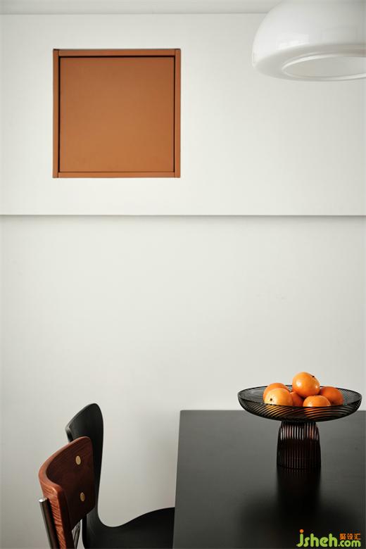 橘色小方框不單是點(diǎn)綴,這是家中電箱的位置,墻面加入局部基層做出方形蓋板,精裝房改造內(nèi)置反彈器可以自由開關(guān)方便檢查。四周嵌入燈帶為餐廳增加氛圍感。