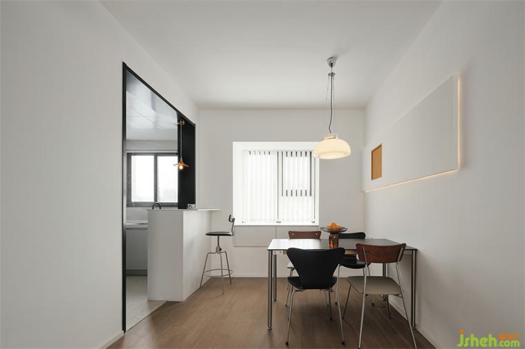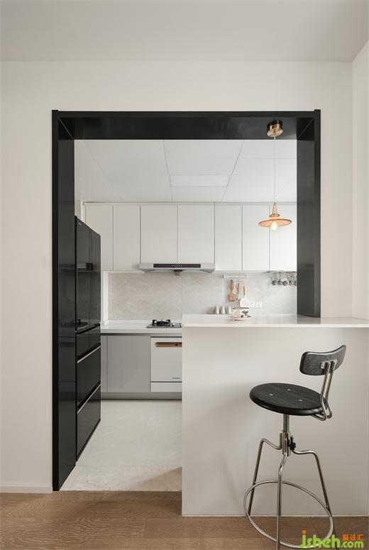 原始廚房是封閉式,拆除后設(shè)計(jì)一米的小吧臺(tái),平時(shí)可用作水吧、傳菜臺(tái),享用早餐。