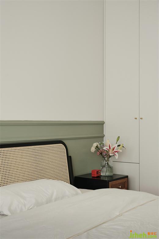 臥室,告別傳統(tǒng)床頭柜,根據(jù)設(shè)計(jì)定制了這樣一款懸浮柜,裝修公司可做女主化妝臺(tái),柜角處還貼心做了弧角,防止磕碰。