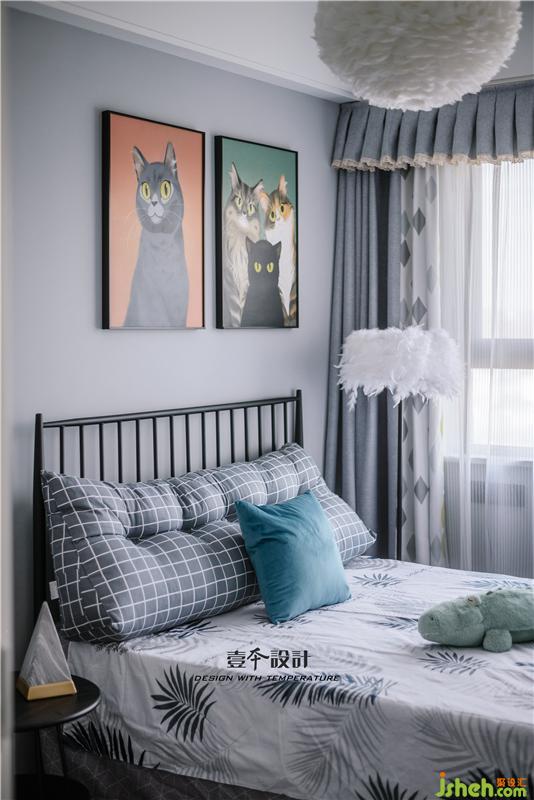 ▲父母房延續(xù)了現(xiàn)代的黑白灰風(fēng)格,魚(yú)骨拼的時(shí)尚、灰色的墻面、印著綠葉的床品、彩色的貓咪掛畫(huà)、黑色的床背,塑造雅致的同時(shí)又給人安靜的愜意感。