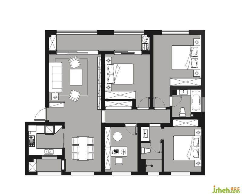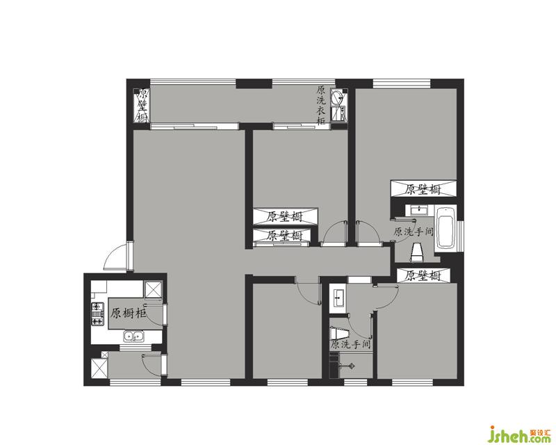 總體來說,該戶型還是不錯的,南北通透,光照充足,動靜分區(qū)合理,儲藏空間充足。戶型上唯一的不足之處在于廚房的采光要經(jīng)過廚房外小陽臺照射進(jìn)來,且廚房門洞狹小顯得擁擠,所以廚房內(nèi)的光照明顯不足。但是廚房已有的瓷磚和櫥柜都需要保留,限制了我們進(jìn)行戶型拆改的靈活性。室內(nèi)設(shè)計師
