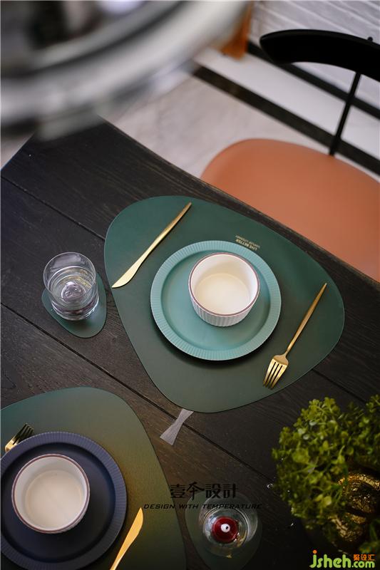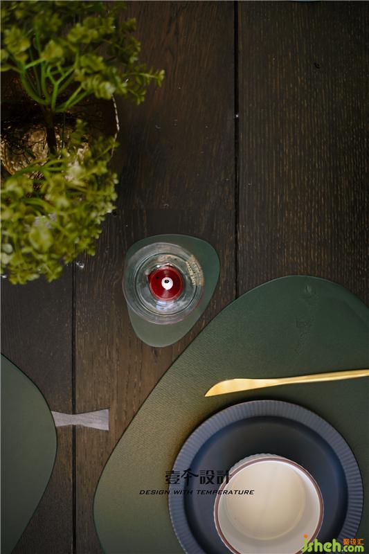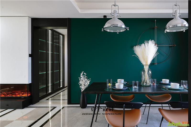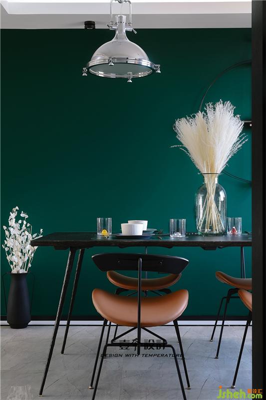 餐廳的綠色背景與沙發(fā)背景遙相呼應(yīng),煙熏實(shí)木拼工業(yè)風(fēng)餐桌以及頂上不銹鋼工礦燈,工業(yè)風(fēng)的氣息撲面而來。室內(nèi)設(shè)計(jì)師