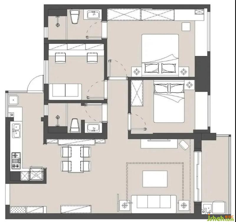 本案戶型南北通透,動靜分區(qū)合理,所以在空間布局上我們幾乎沒有做改變。只是把廚房和餐廳做了聯(lián)通,其中開放式廚房的設(shè)計(jì)加強(qiáng)了與餐廳空間的聯(lián)系,使得餐廚區(qū)域更為完整,符合了業(yè)主的生活習(xí)慣。這套精裝房的原有裝修大部分都需要保留,比如地磚下有地暖,而廚房、衛(wèi)生間涉及到水電管路和防水基層,如果隨意拆改則較為浪費(fèi)且成本太高,不符合我們精裝房改造的定位。所以我們把設(shè)計(jì)思路主要放在軟裝布置及顏色改造上面,我們認(rèn)為硬裝是殼,軟裝是靈魂,語言是無力的,我們一起來看看實(shí)景吧!室內(nèi)設(shè)計(jì)師