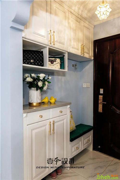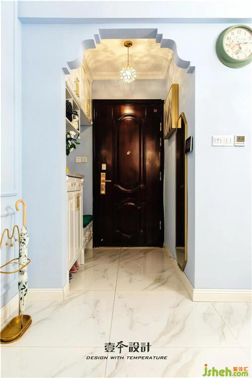 打開門,玄關(guān)處花瓣一樣的拱形門洞在歡迎主人回家。墻面以藍(lán)色為基調(diào),搭配白色的柜子,寧靜的藍(lán)色與素雅的白色,清新自然。金屬拉手裝飾其中,搭配花朵形狀的小吊燈,精致的生活處處彰顯。
