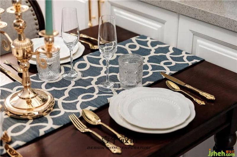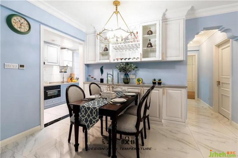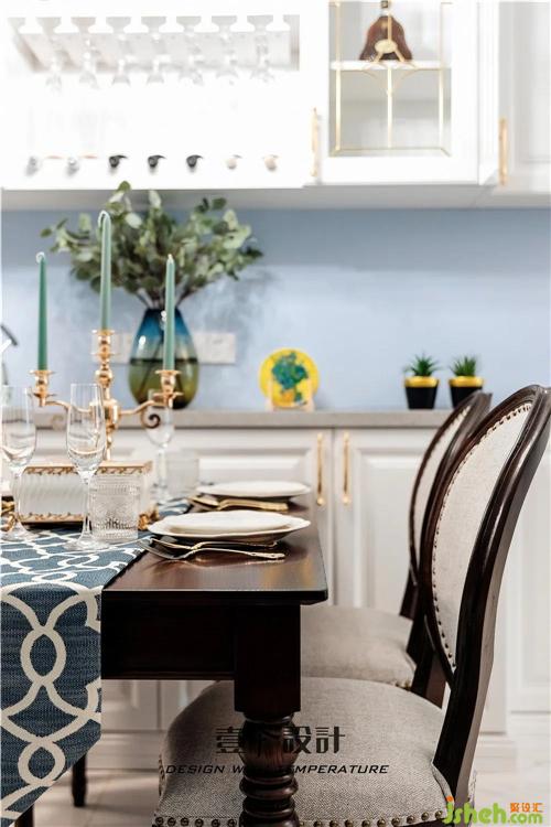 藍(lán)色浪漫一直延續(xù),沉穩(wěn)的木質(zhì)餐桌椅與華麗的水晶吊燈結(jié)合,精致又大方。餐桌旁邊的吊柜和儲物柜,滿足了收納和展示的需求。金色的餐具優(yōu)雅高端,散發(fā)著滿滿的輕奢氣息。