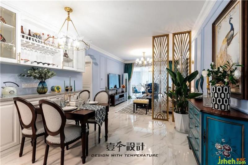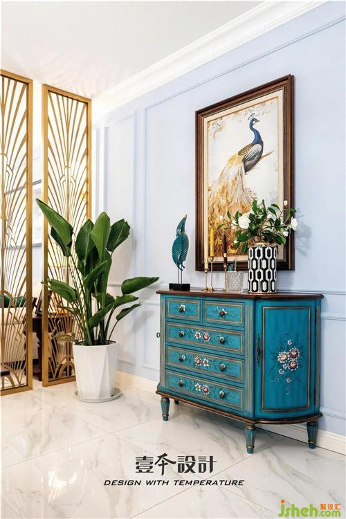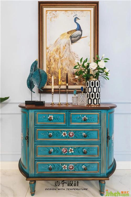 餐廳旁邊的孔雀藍(lán)裝飾柜映入眼簾,擺上喜歡的花瓶,插上三兩只花,芳香彌漫而開,實(shí)用性裝扮性都超強(qiáng)。最愛它那復(fù)古味道與華麗的孔雀裝飾畫相襯托,點(diǎn)睛這餐前一景。室內(nèi)設(shè)計(jì)師