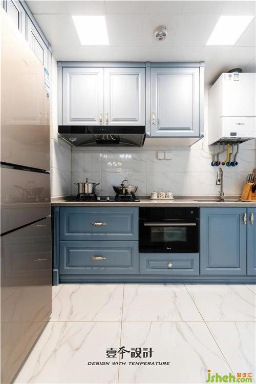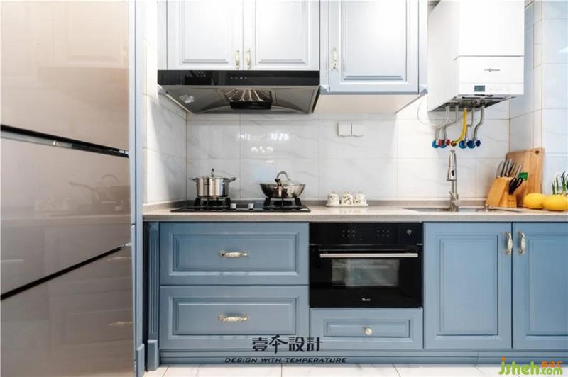 廚房只更換了櫥柜門板,氣質(zhì)便煥然一新。簡潔明亮的白色墻磚和藍(lán)色柜體,提升了整個(gè)廚房的空間感。開放式廚房的巧妙利用,使餐廳與廚房緊密相連,營造出一個(gè)溫馨的就餐環(huán)境。
