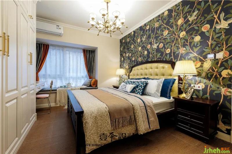 主臥床頭背景墻的墻紙是石榴花紋的圖案,花的枝蔓攀沿到臥室。自然、懷舊,仿佛散發(fā)著幸福的味道,營造溫情與浪漫的氛圍,