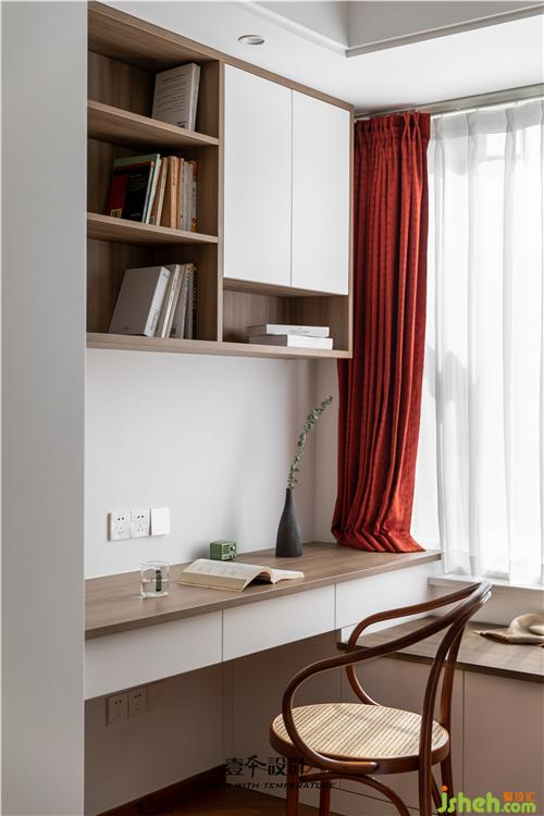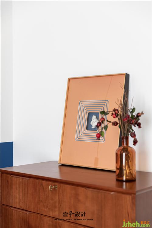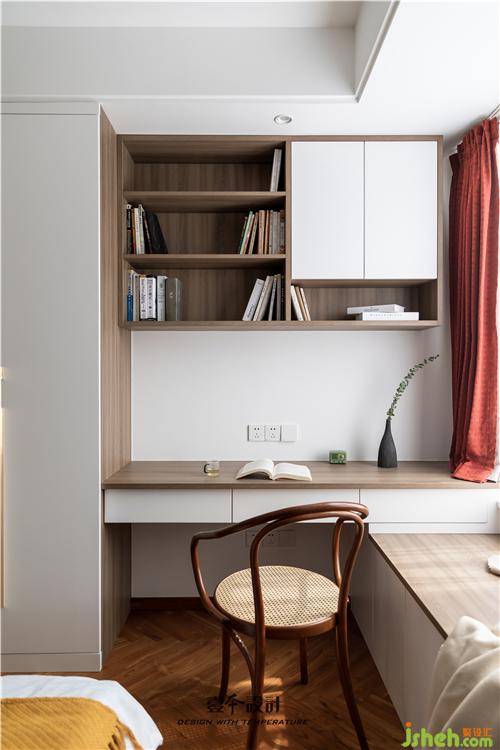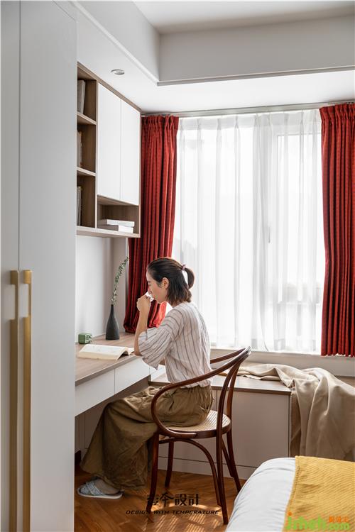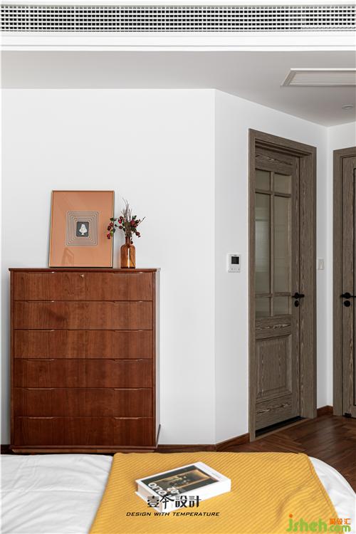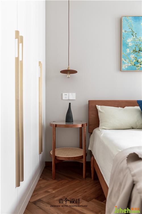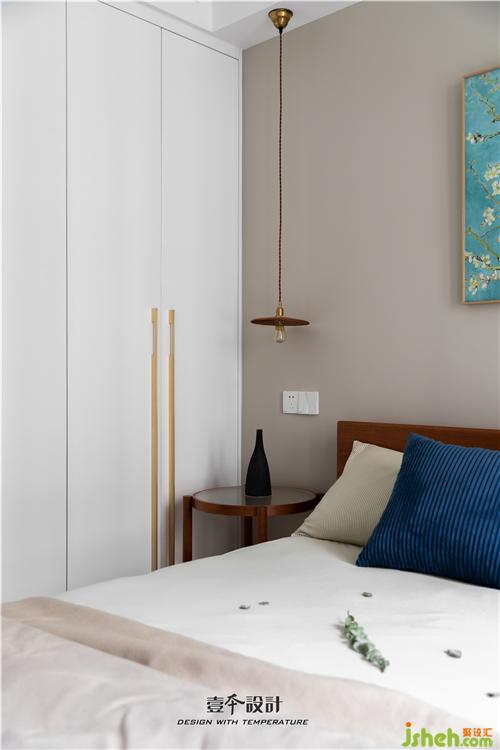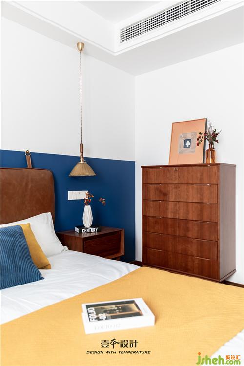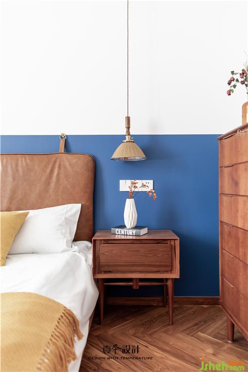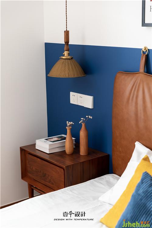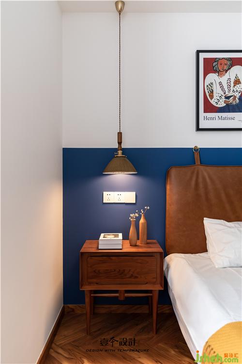 主臥藍(lán)色背景和黃色抱枕的結(jié)合,使空間看起來不枯燥,能夠感受到活潑新鮮感。牛皮靠背的真皮床,簡約中融合了品質(zhì)、藝術(shù)與功能實(shí)用。衣柜旁還有一處休閑區(qū),休閑舒適的氛圍不失空間的功能性與沉穩(wěn)感,光影交錯,在飄窗上灑下一米陽光。