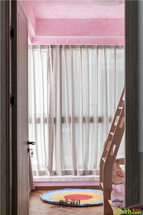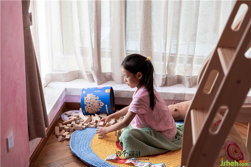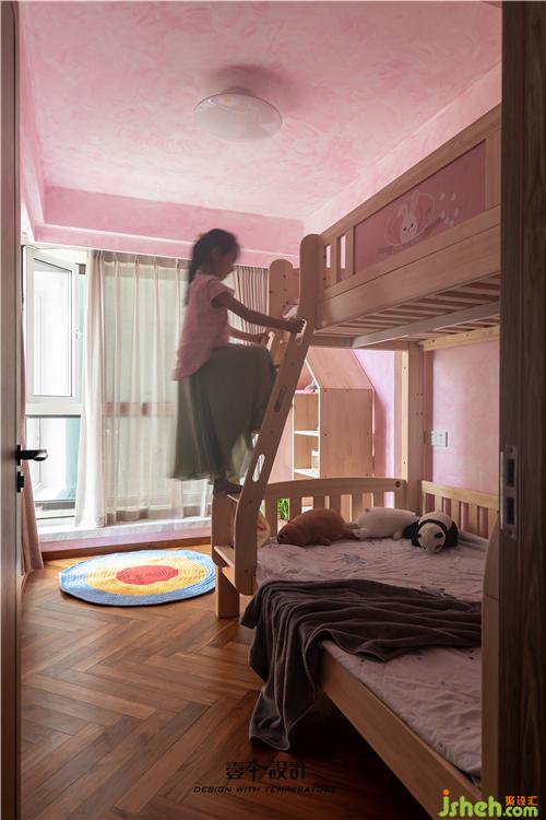 兒童房大面積采用了女兒最喜歡的粉色,特別一提的是,粉色的藝術(shù)漆是由陽(yáng)老師和女兒自己親手刷上去的,手工藝術(shù)漆變幻的質(zhì)感、彩色圓形地毯盡顯童趣,拍照當(dāng)天這里就是孩子的天地。