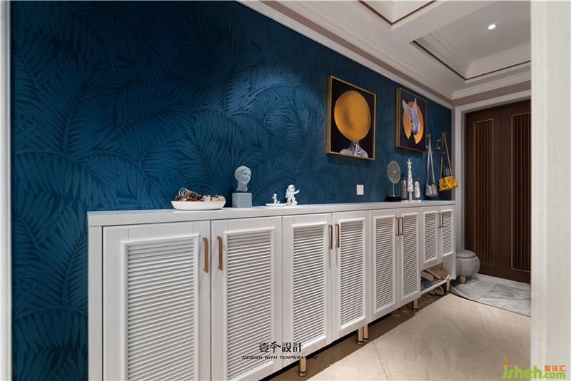 進門右手墻面比較長,為降低視覺上的沖擊力,室內(nèi)設(shè)計師做了一組鞋柜,進門將包包等物品掛在金屬掛鉤上,坐在換鞋凳把鞋換下,底部懸空便于收納常用拖鞋,百葉門鞋柜搭配金屬把手,簡潔大方。