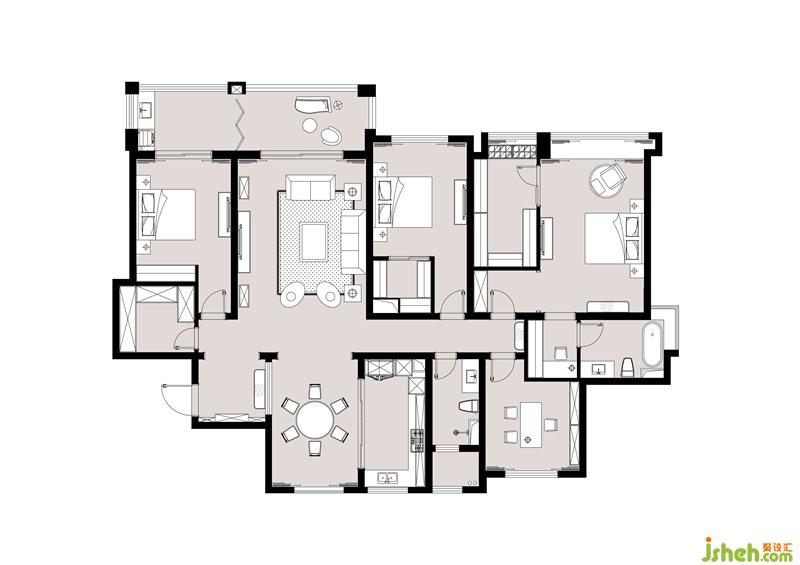 2:將北面小陽(yáng)臺(tái)納入餐廳區(qū)域,增大餐廳面積。