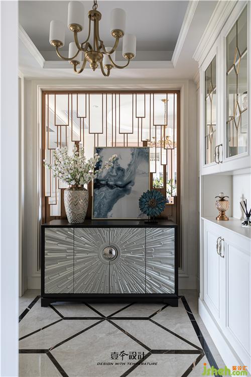推開(kāi)門(mén),一個(gè)優(yōu)雅大氣的入戶(hù)玄關(guān)區(qū)呈現(xiàn)在我們眼前,迎面是一組輕奢質(zhì)感的金屬元素玄關(guān)柜和裝飾畫(huà),讓人眼前一亮的同時(shí)也增加了收納空間。原來(lái)厚重的墻體拆掉室內(nèi)設(shè)計(jì)師設(shè)計(jì)成通透的金屬隔斷,引入光線(xiàn)、增加空間之間的連通,達(dá)到移步易景的效果。進(jìn)門(mén)右邊的整墻鞋柜,特意設(shè)計(jì)成深淺疊進(jìn)的造型,即解決了門(mén)邊墻體尺寸不夠鞋柜厚度的問(wèn)題,也讓整墻鞋柜不顯得死板。