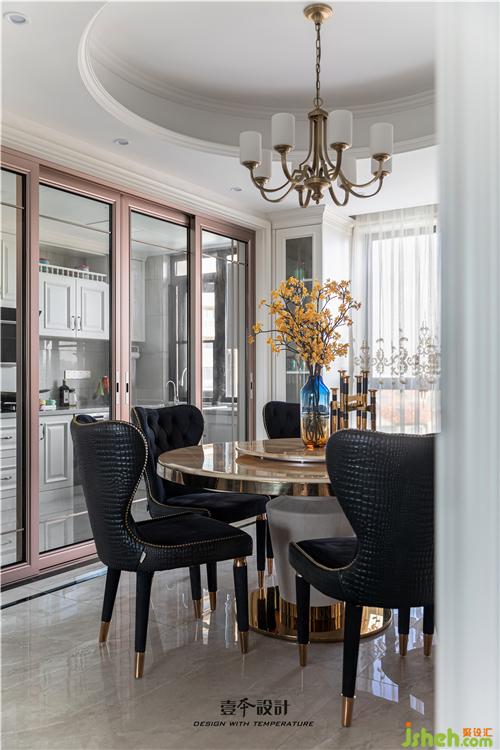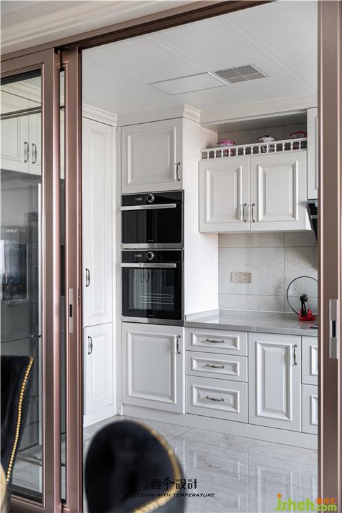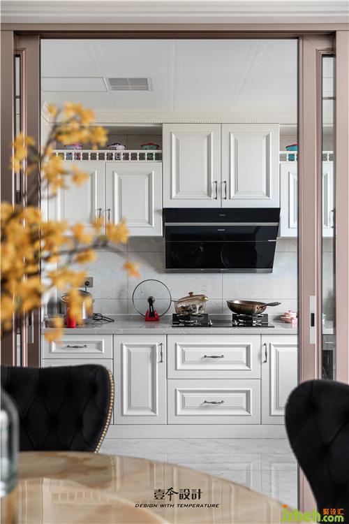 廚房白色的櫥柜,搭配復(fù)古銅色拉手,廚房和餐廳用推拉式玻璃門(mén)進(jìn)行隔斷,室內(nèi)設(shè)計(jì)師選用玫瑰金色的移門(mén)邊框,延續(xù)輕奢的質(zhì)感,整個(gè)廚房?jī)?yōu)雅又精致。