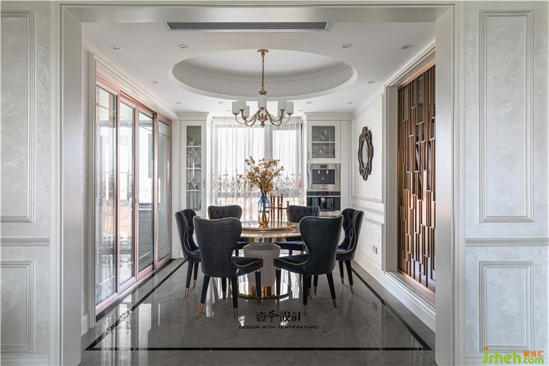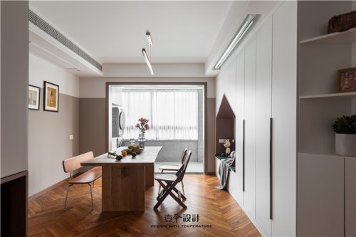 玄關(guān)與餐廳之間用一組虛實(shí)相間的金屬隔斷來(lái)進(jìn)行區(qū)域劃分,既滿(mǎn)足一定的隱私性,又能保證空間的通透性。北陽(yáng)臺(tái)納入餐廳空間后,餐廳變得寬敞大氣,我們還設(shè)計(jì)了兩組到頂?shù)墓褡臃胖每Х葯C(jī)和精美的餐具,充分利用空間,實(shí)用又美觀。
