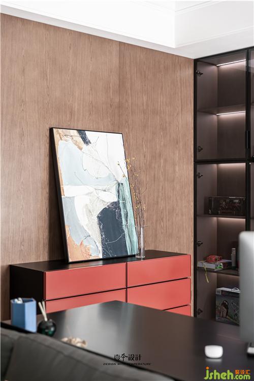 客廳沙發(fā)背后打造成為休閑的書房區(qū)域,室內(nèi)設(shè)計師用沙發(fā)與書桌將區(qū)域分隔,在這里看看書沐浴陽光,好不愜意?,F(xiàn)在落地畫擺放的位置是將來為孩子們預(yù)留放鋼琴的地方。