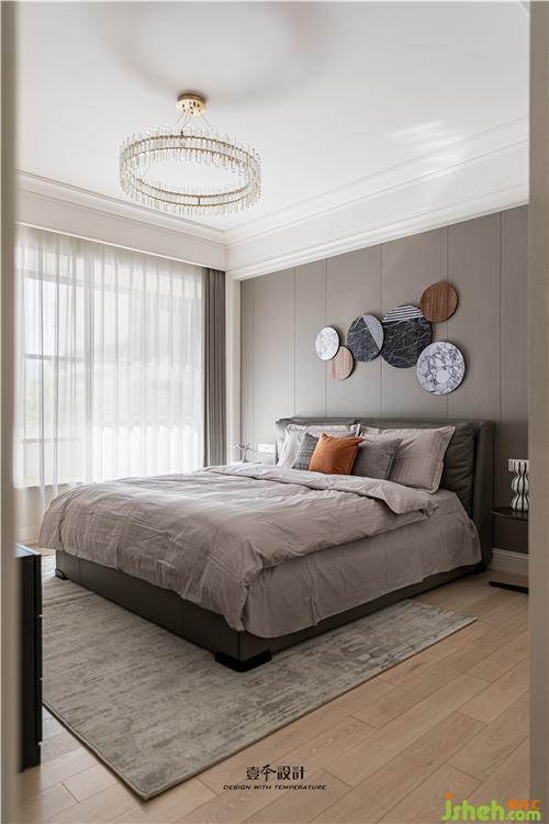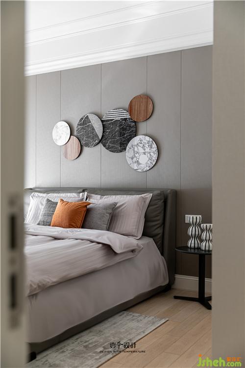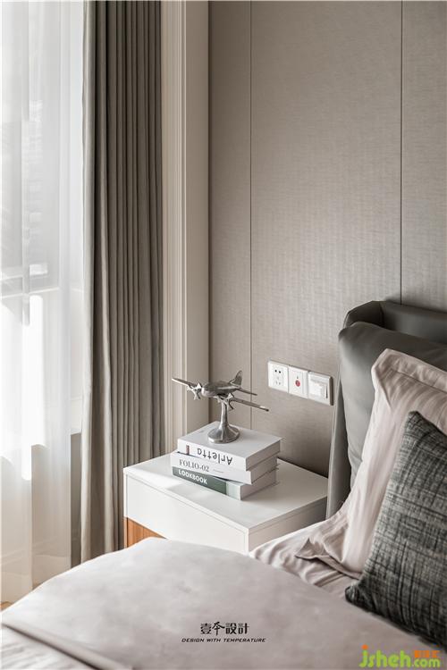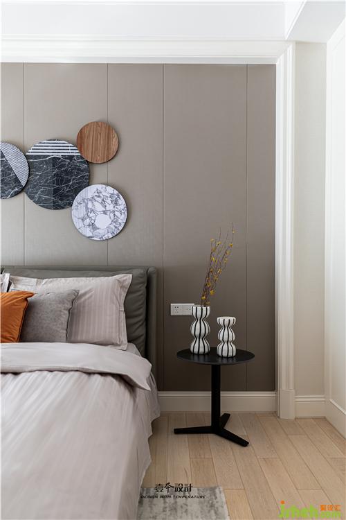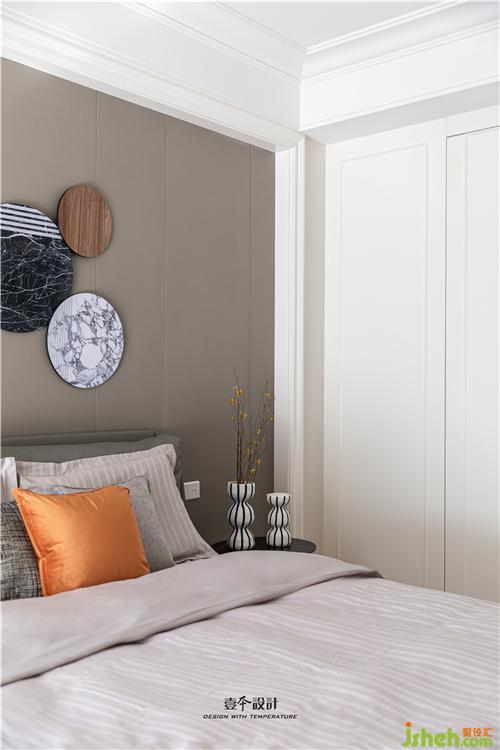 主臥床頭背景保留原造型不做改變,室內(nèi)設(shè)計師精心選擇一個點睛的裝飾物來達到增色的效果,并通過床品、家具、窗簾的顏色搭配來烘托溫暖舒適的睡眠空間。