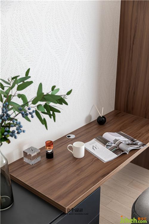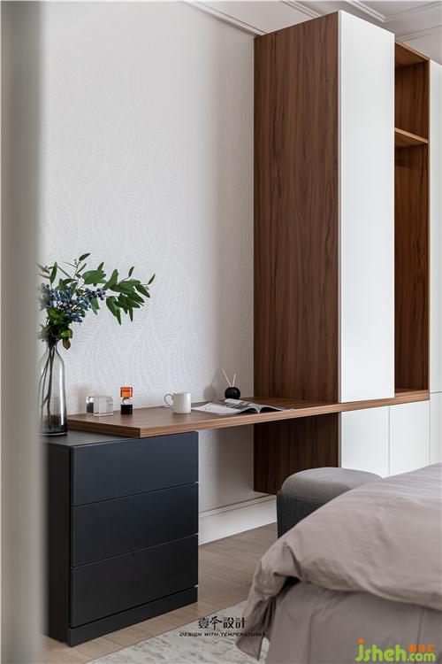 將衣柜與梳妝臺合二為一,二者通過大板連接起來,自然而流暢的將女主梳妝臺與日常的隨手掛放,儲物區(qū)域融為整體。